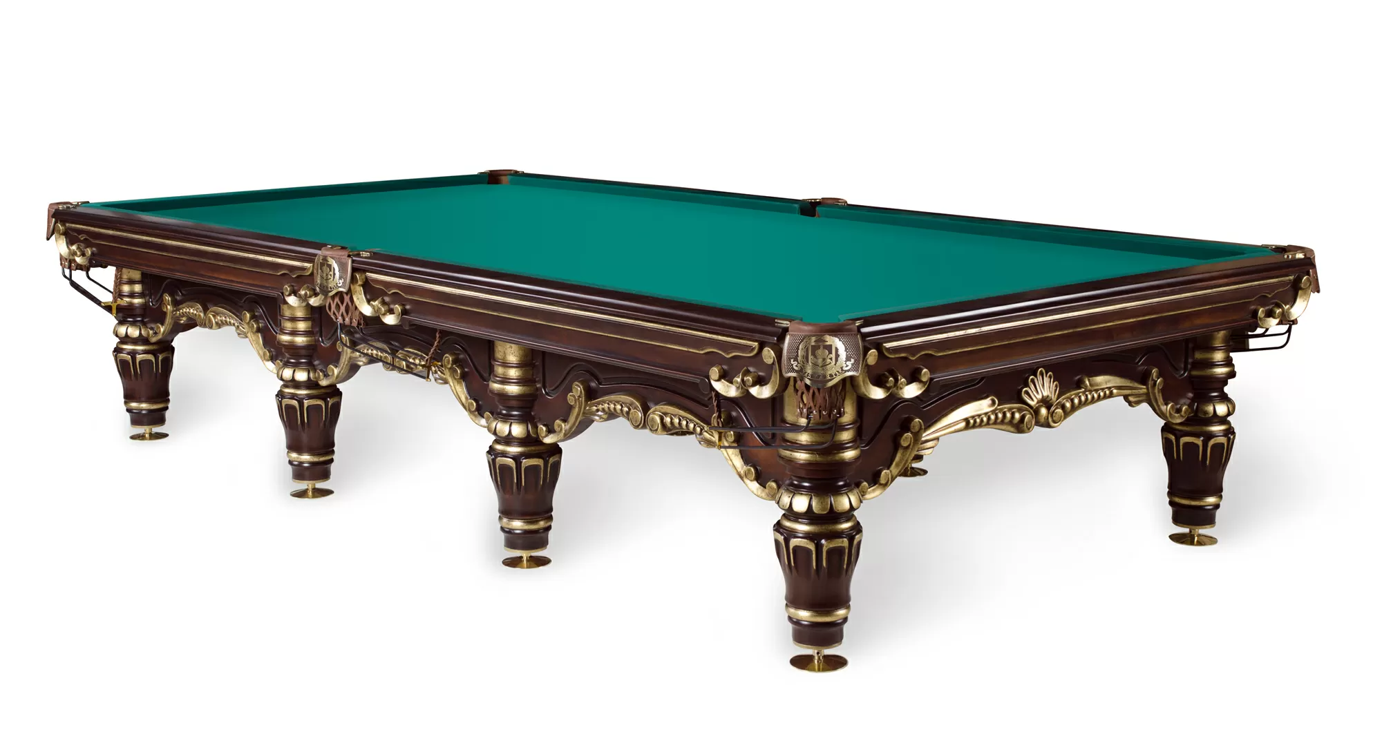 Бильярдный стол «Император-Люкс», украсит любые апартаменты. Резные узоры на лафете из натурального дерева, качественный сланец игрового поля, лучшие сукно и бортовая резина.