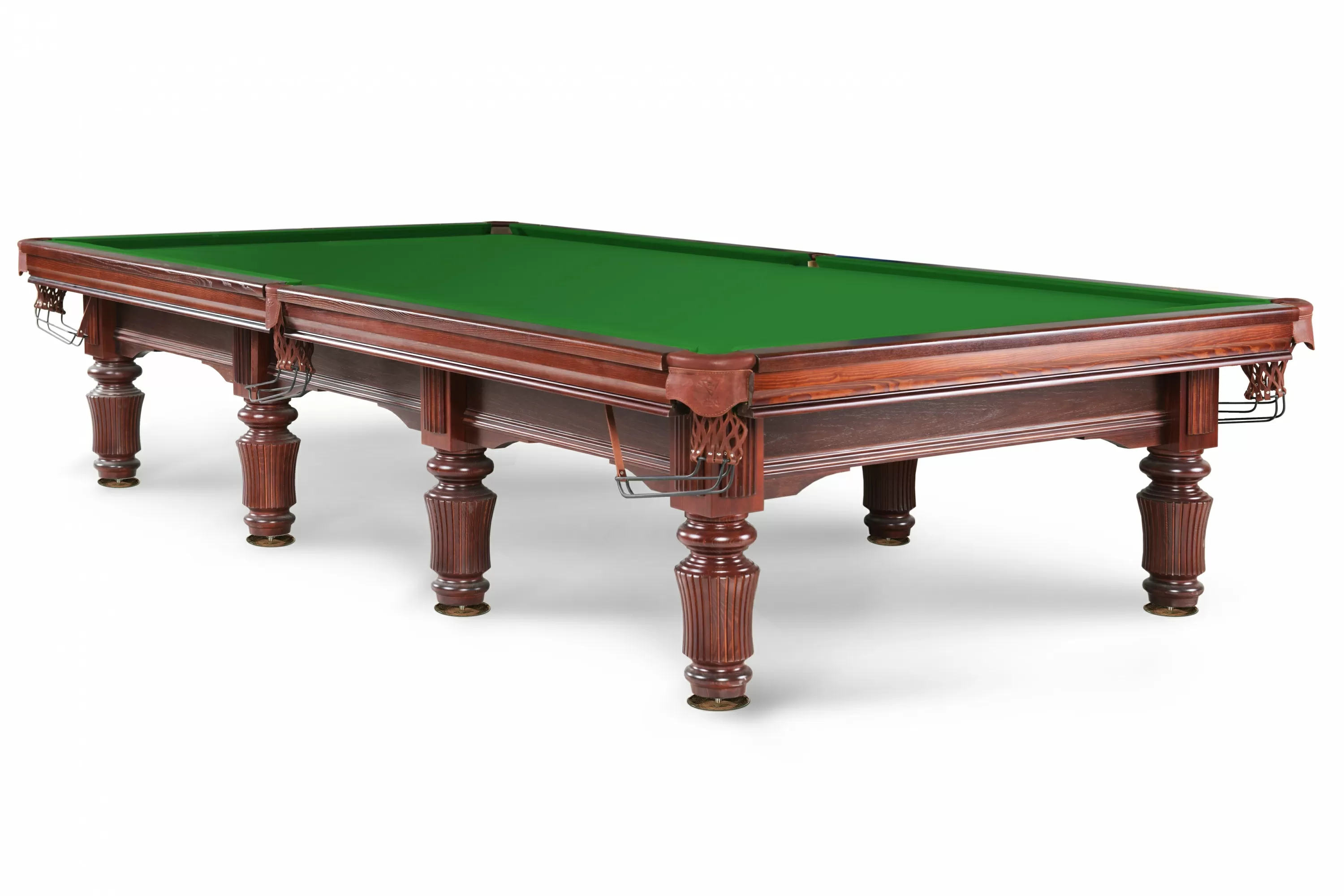 Модель также усовершенствована усиленным крепежом, в изготовлении используется исключительно массив дерева и лузы из натуральной кожи. В столе такого уровня используются только лучшие комплектующие: сукно Manchester snooker и амортизаторы Start Snooker L-77.