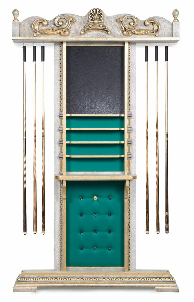 Модель напольная, предназначена для 6 киев, позволяет разместить треугольник, мелки, а также бильярдные шары. Материал клен. Есть возможность выбрать цвет из палитры Фабрики «Старт»